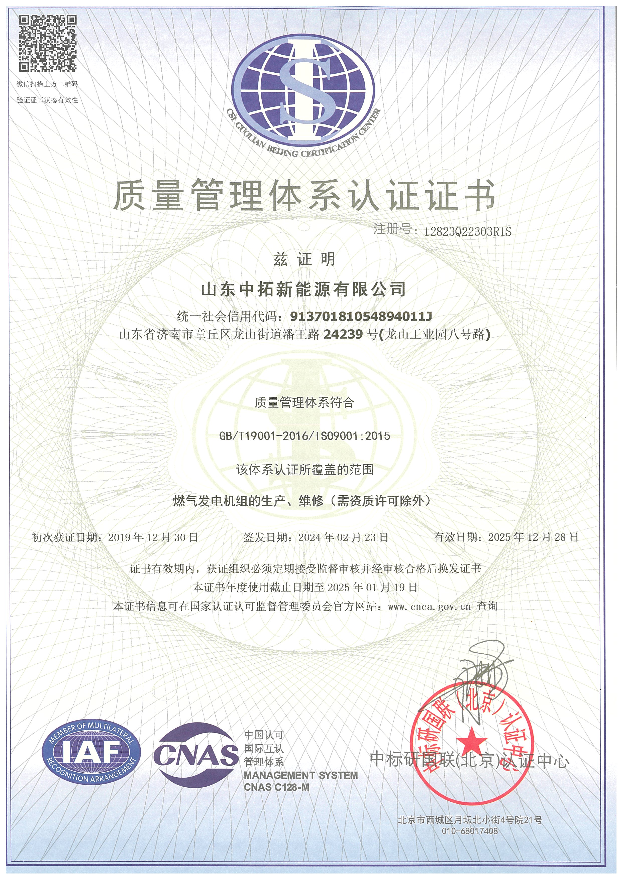質量管理體系認證證書